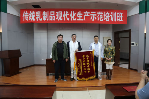 来自内蒙古自治区的新巴尔虎左旗就业服务局局长苏德代表牧民感谢食品学院的专家们多年来为蒙区农牧民搭建的奶制品深加工操作平台,以及为蒙区农牧民致富做出的卓越贡献。他说,随着互联网以及加工生产方式的变革,传统乳制品的生产和推广也面临全新挑战。目前蒙区传统乳制品企业多为中小微型,缺乏规模化经营及统一的行业标准、存在工艺技术传承方式单一、品种和口味地域差异显著等问题。他表示,食品学院是我国现代乳业加工的先驱,具备雄厚的科研实力和广泛的社会影响力,培训班更是学院以传统乳制品创新研发为依托,提升行业生产规范、科技水平以及市场竞争力为主旨的惠民行动,对改善农牧民的生产和生活质量有着重要的促进作用。希望能与食品学院进行更加广泛和深入的交流合作。他同时强调,希望学员把握难得的机会,积极参与学习和实践,共同营造互动共进的氛围。为再一次表达对学校及学院的感谢,苏德携牧民为买球赛的app官网领导敬献哈达。