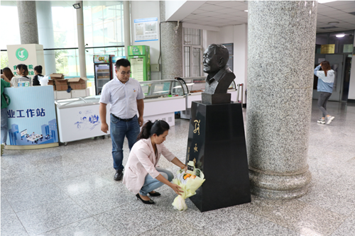 学院党委副书记钱芳、副处级辅导员刘双奇向骆承庠先生铜像敬献鲜花