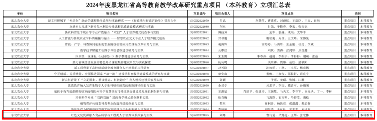 近日,黑龙江省教育厅印发《关于公布2024年度黑龙江省高等教育教学改革研究项目立项名单的通知》(黑教研函[2025]24号)。我院获批立项4项,其中刘骞主持的“红色文化资源融入食品科学与工程类人才培养体系探索与实践”获批重点项目。程金菊主持的“数字化转型和工程教育认证背景下‘乳品化学’教学创新与深化改革”、张国芳主持的“工程认证背景下面向产业导向的乳品机械设备教学模式的研究”、陈旭主持的“黑龙江高校创新创业教育评价体系构建策略研究”获批一般项目。