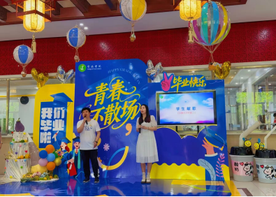文艺演出在毕业生合唱《凤凰花开的路口》中拉开序幕,学联诗朗诵《致我们的青春岁月》倾诉不舍,辅导员活力演绎《向快乐出发》点燃全场。定制小熊、行李牌等抽奖礼物传递学院关怀。活动现场遍布“手工爱意”的巧思。奶粉罐变身憨态可掬的小蜜蜂,纸壳化作巨型“蛋糕”与“冰激凌”,充气球搭配麻绳成悬浮“热气球”,PVC水管喷涂成绚烂“烟花”,水桶变身可爱“酸奶桶”……这些师生变废为宝的设计,无声诠释着“装满行囊再出发”的期许。