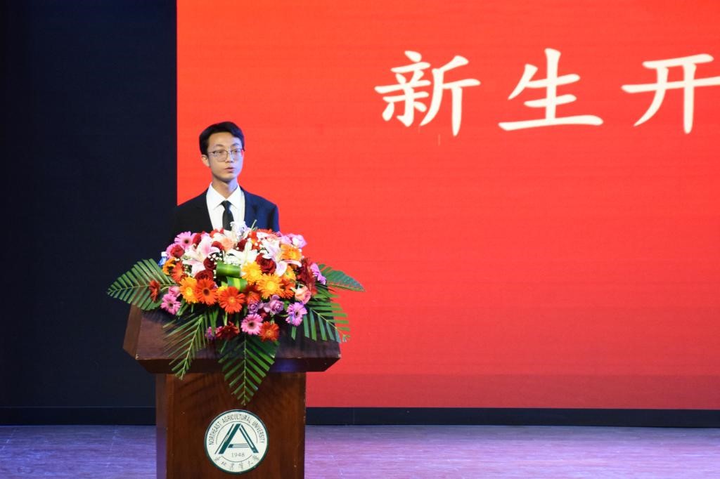 新生代表2018级本硕博理科实验班梁言同学,代表全体新生向学校、老师承诺:要努力学习科学文化知识,用正确的思想引领大学生活,注重能力锻炼,严格遵守校规校纪,弘扬科学精神,做勤奋好学的好学生。