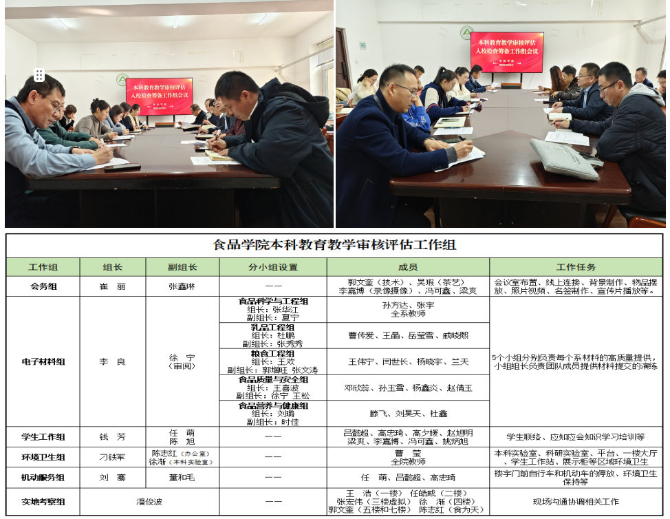 为进一步规范流程、确保审核评估线上、线下各环节有序进行,周密做好迎接本科教育教学审核评估各项工作任务,我院组建了会务组、电子材料组、学生工作组、环境卫生组、机动服务组、实地考察组等6个迎评专项工作组,并分别召开了各工作组会议。会议在听取各工作组意见建议、问题反馈基础上,进一步明确了各工作组责任分工,并协调落实了设备保障、人员保障、场地保障。