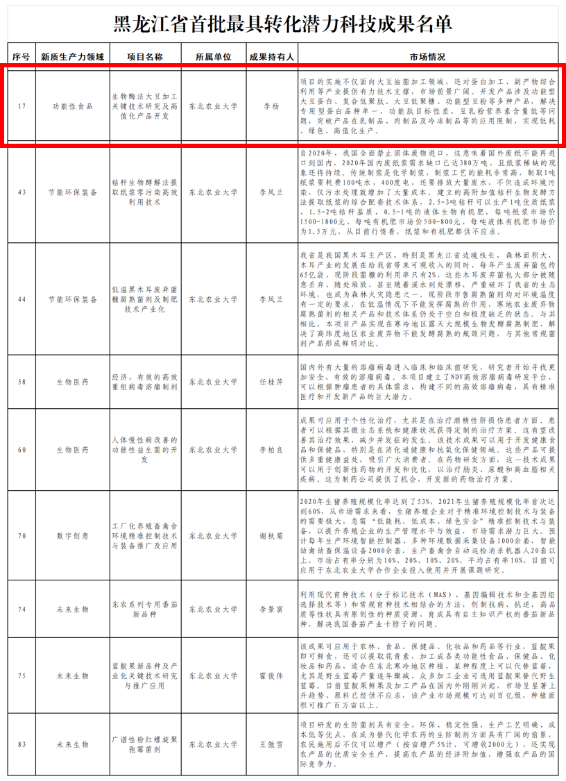 经过前期专业机构形式审查、首轮初评筛选、线上BP盲审及路演评审等多轮评选,近日,黑龙江省科学技术厅公布了“黑龙江省首批最具转化潜力科技成果名单”,共评选出最具转化潜力科技成果106项。买球赛的app官网9个项目入选成果数量排名全省高校第四位,位居省属高校首位。