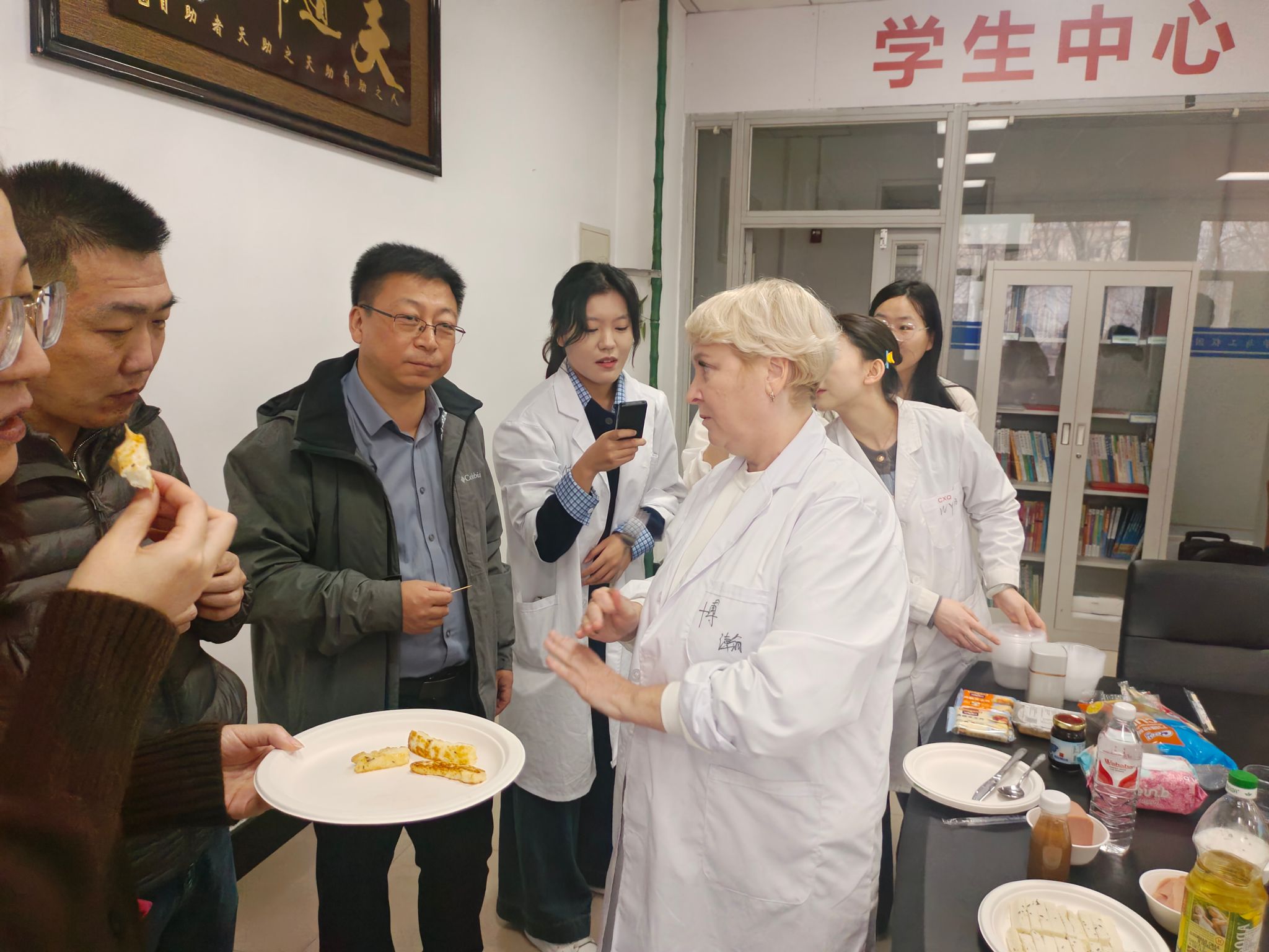 在中俄科教合作交流研讨会上,沃罗热基娜·娜塔莉亚·赫伯托夫娜教授向师生详细讲解了传统发酵食品在俄式饮食文化中的起源、发展及重要地位,邀请参会人员对奶酪、格瓦斯及俄罗斯特色煎饼进行品鉴,并就其制作工艺、营养价值、感官品质优化及产业化发展与大家进行了深入交流。
