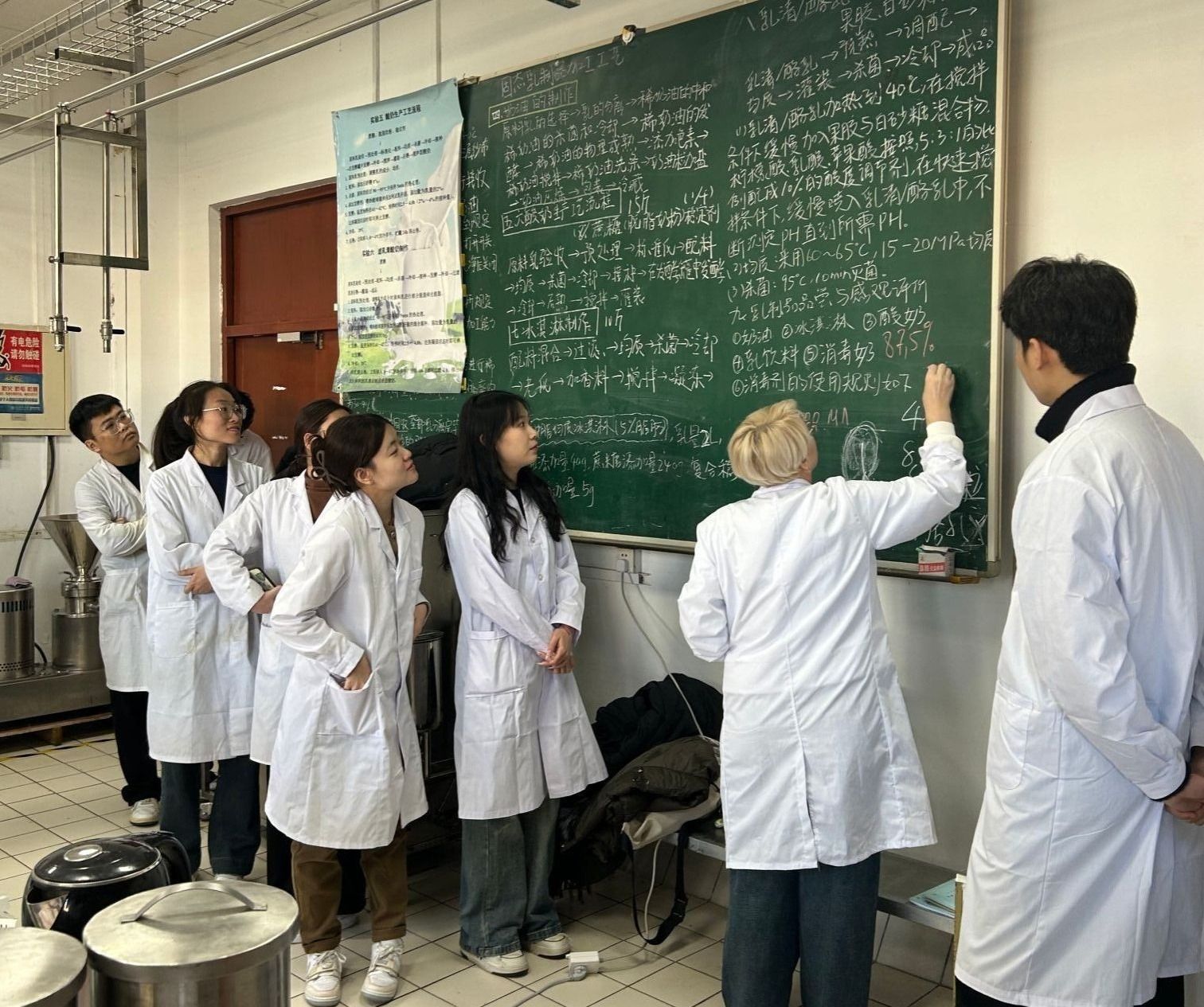 交流期间,沃罗热基娜·娜塔莉亚·赫伯托夫娜教授围绕俄罗斯传统发酵食品制作开展教学实验,现场演示了不同风味的俄罗斯传统奶酪(Halloumi奶酪、Casciotta奶酪、Adyghe奶酪、俄罗斯奶酪)及格瓦斯的制备流程,并就原料选取、工艺参数等细节对学生进行耐心指导。