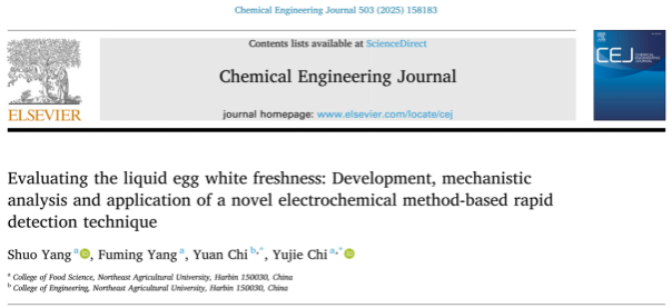 202412月,我院迟玉杰教授与工程学院迟媛教授在国际期刊Chemical Engineering Journal(中科院一区TOPIF: 13.3)联合发表题为“Evaluating the liquid egg white freshness: Development, mechanistic analysis and application of a novel electrochemical method-based rapid detection technique”的研究论文。我院22级博士生杨硕为第一作者,杨福明老师为共同作者,迟玉杰教授和迟媛教授为通讯作者,该研究得到了十四五国家重点研发计划(No. 2022YFD2101005)的支持。