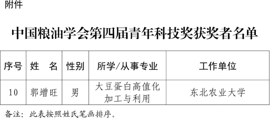 近日,中国粮油学会公布第四届青年科技奖获奖者名单。按照《中国粮油学会科学技术奖管理办法》《中国粮油学会青年科技奖实施细则》等有关要求,经单位推荐、形式审查、专家初评、综合评审、评审结果公示、奖励委员会审定等程序,我院江连洲教授团队郭增旺副教授荣获“中国粮油学会第四届青年科技奖”。