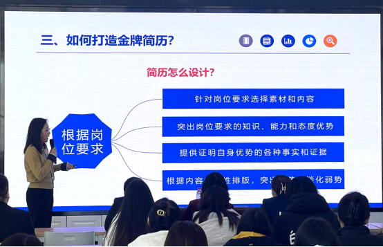 李云丹从简历的底层逻辑、HR眼中的简历、如何打造金牌简历以及面试相关注意事项四方面为同学们进行了指导培训。她结合用人单位岗位需求以及学生专业背景,通过深层次讲解简历撰写的技巧、列举实际案例、提出合理化建议使同学们学会运用“科学方法+数字说话+适当包装”的方式打磨高质量简历,递好给企业的第一张“名片”。同时,李云丹全面讲授了面试着装技巧、礼仪技巧、交谈原则和注意事项,指导学生如何有效准备面试内容、充分了解用人单位、清晰表达个人想法及展现自身的仪表涵养、知识经验和业务能力。
